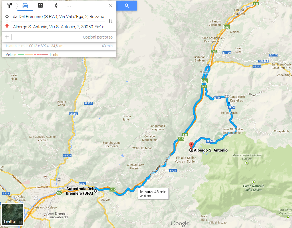 Siccome la strada provinciale SP24, da Prato Isarco (Blumau) a Fiè allo Scicliar è chiusa per lavori, è necessario cambiare strada per giungere al luogo dell'incontro. Chi arriva da Sud, in autostrada, può uscire a Bolzano Nord o Chiusa e prendere il bivio a Ponte Gardena (Waidbruck) in direzione Castelrotto. Si allega l'estratto da Google Maps per giungere a destinazione, uscendo a Bolzano Nord.
