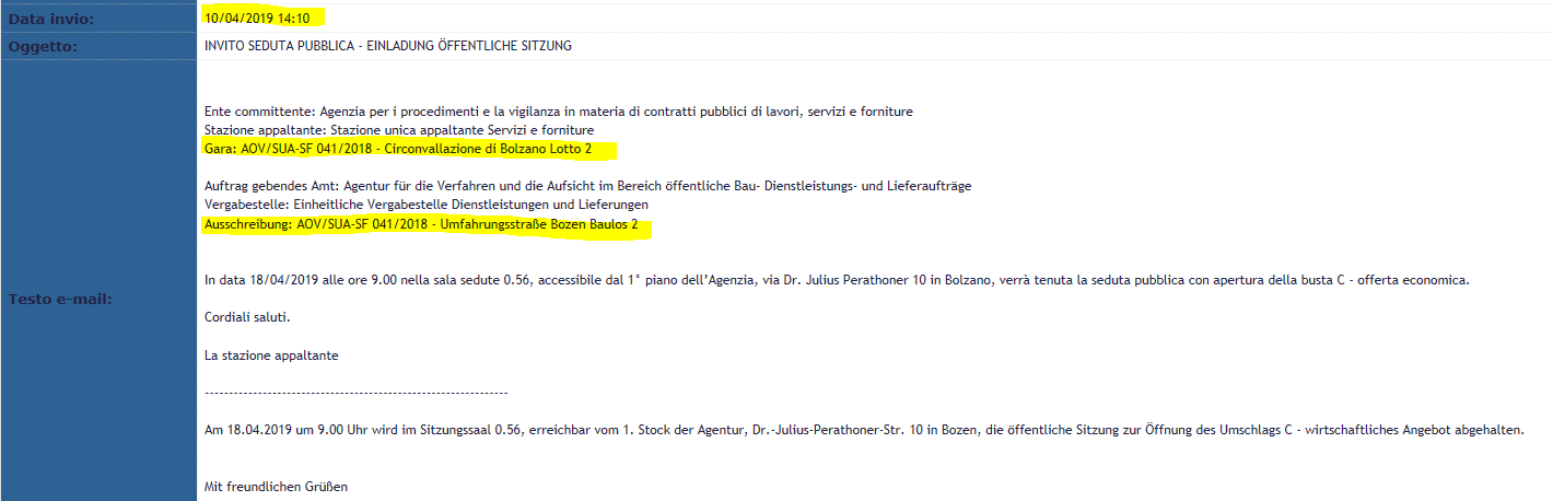 In data 18/04/2019 alle ore 9.00 nella sala sedute 0.56, accessibile dal 1° piano dell’Agenzia, via Dr. Julius Perathoner 10 in Bolzano, verrà tenuta la seduta pubblica con apertura della busta C - offerta economica.