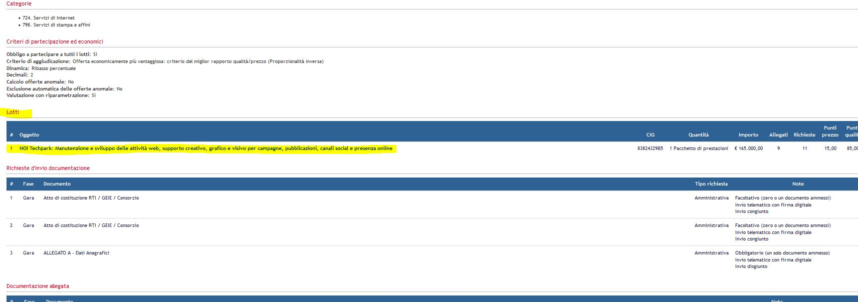 gli allegati A e C sono generati automaticamente dal portale. Gli ulteriori allegati si trovano nel lotto alla fine della pagina: Clickare prima nella sezione "Lotti" su "NOI Techpark: Manutenzione e sviluppo delle attività web, supporto creativo, grafico e visivo per campagne, pubblicazioni, canali social e presenza online". Alla fine della pagina possono essere scaricati gli allegati (vedasi anche screenshot in allegato).